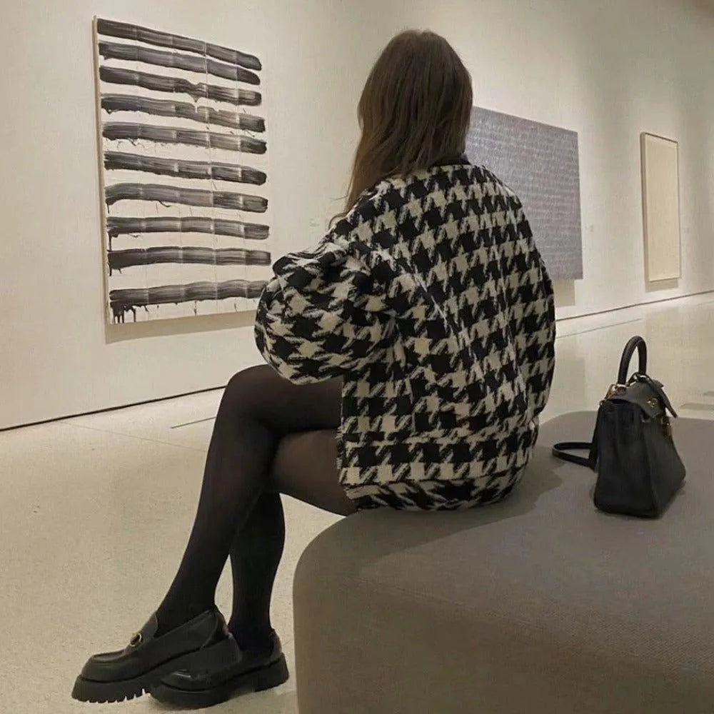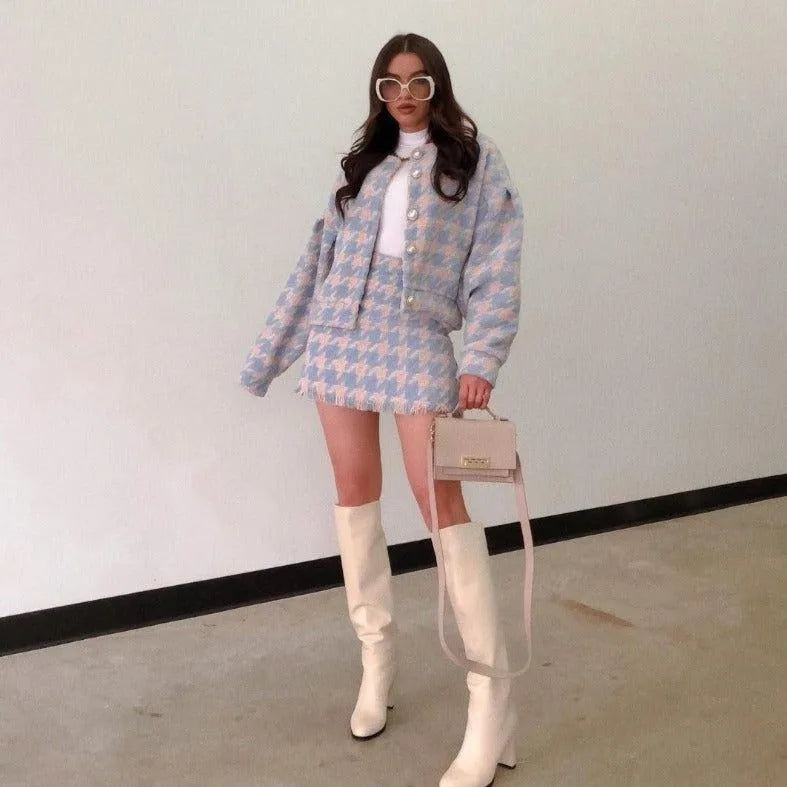 Chic, coordinated, and effortlessly elevated — the Vienna Houndstooth Two-Piece Set brings timeless style with a modern twist. Featuring a cropped, structured jacket with statement pearl buttons and a matching mini skirt with raw hem detail, this set delivers a polished yet playful look you can wear from day to night.