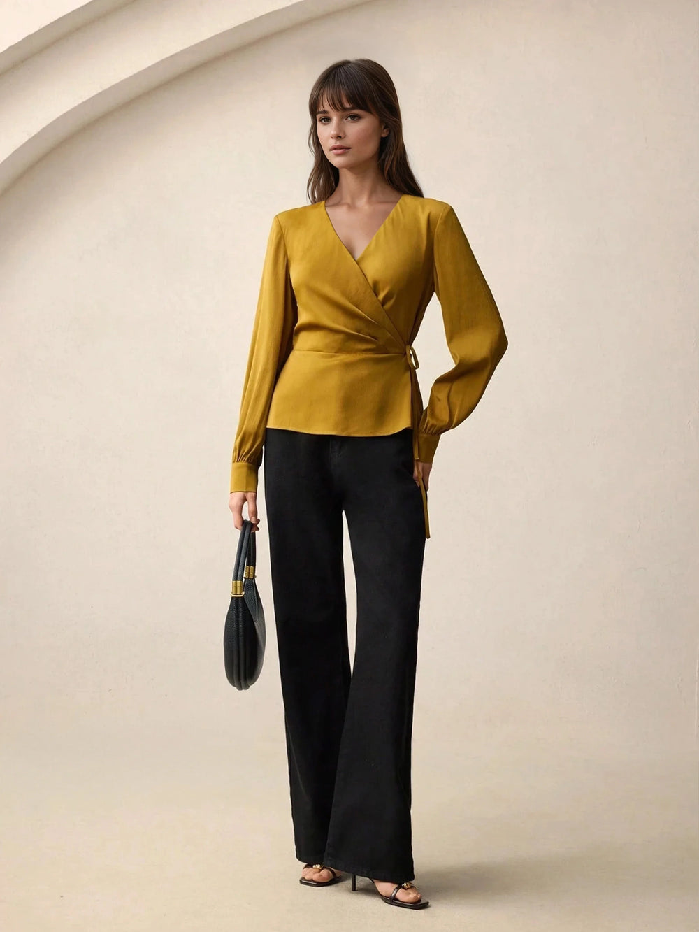 Satin Blouse With Tie Waist Peplum V Neck Long Sleeve