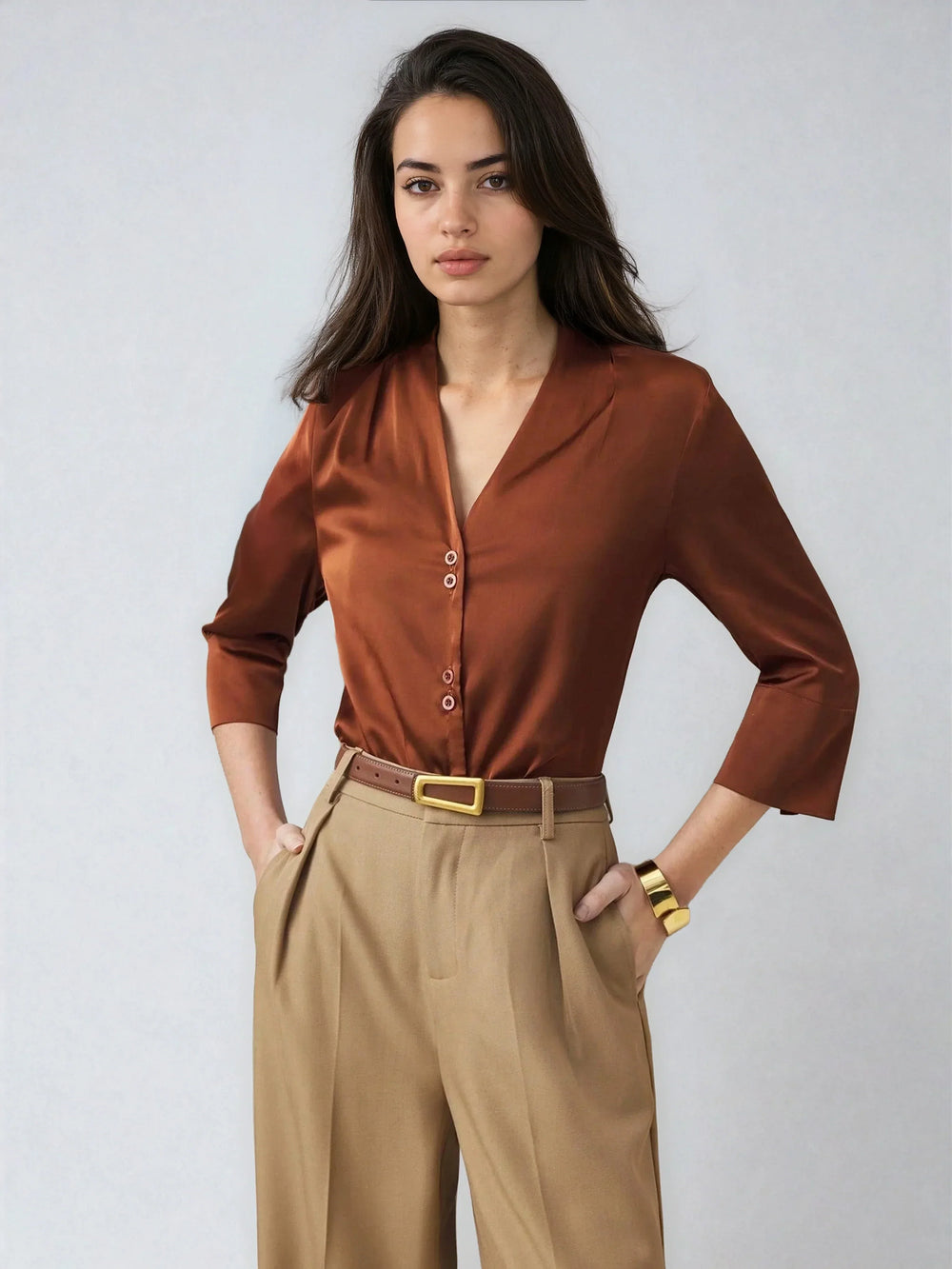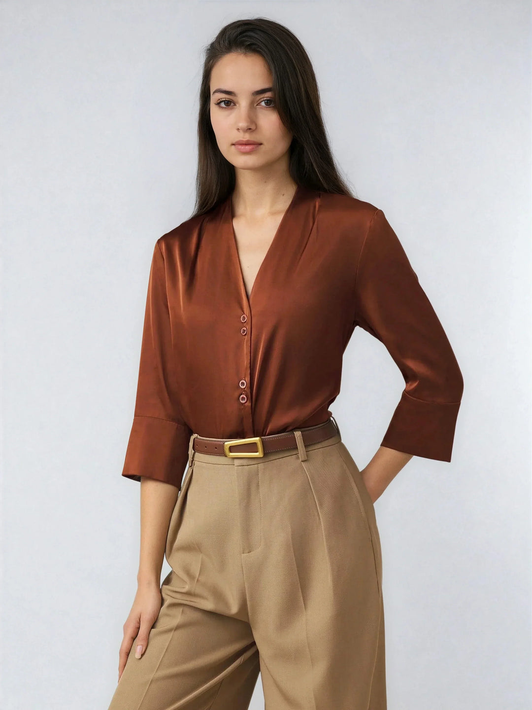 Satin V Neck Top Three Quarter Sleeves Casual Style