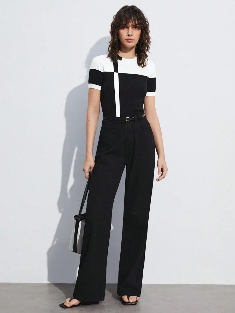 Two Tone Knit Top Short Sleeve Casual Effortless Style