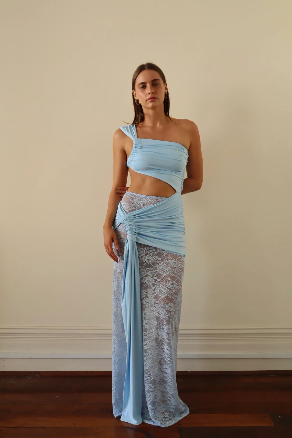 Crafted for bold sophistication, the Marbella Dress is a sultry, one-shoulder maxi that fuses rich textures and sculptural draping. Cut in a deep wine hue, this piece features asymmetric ruching at the waist, a sheer floral lace panel that flatters the legs, and a gathered sash detail that adds movement with every step. A side cut-out at the waist completes the look with a modern edge—perfect for evening soirées and unforgettable entrances.