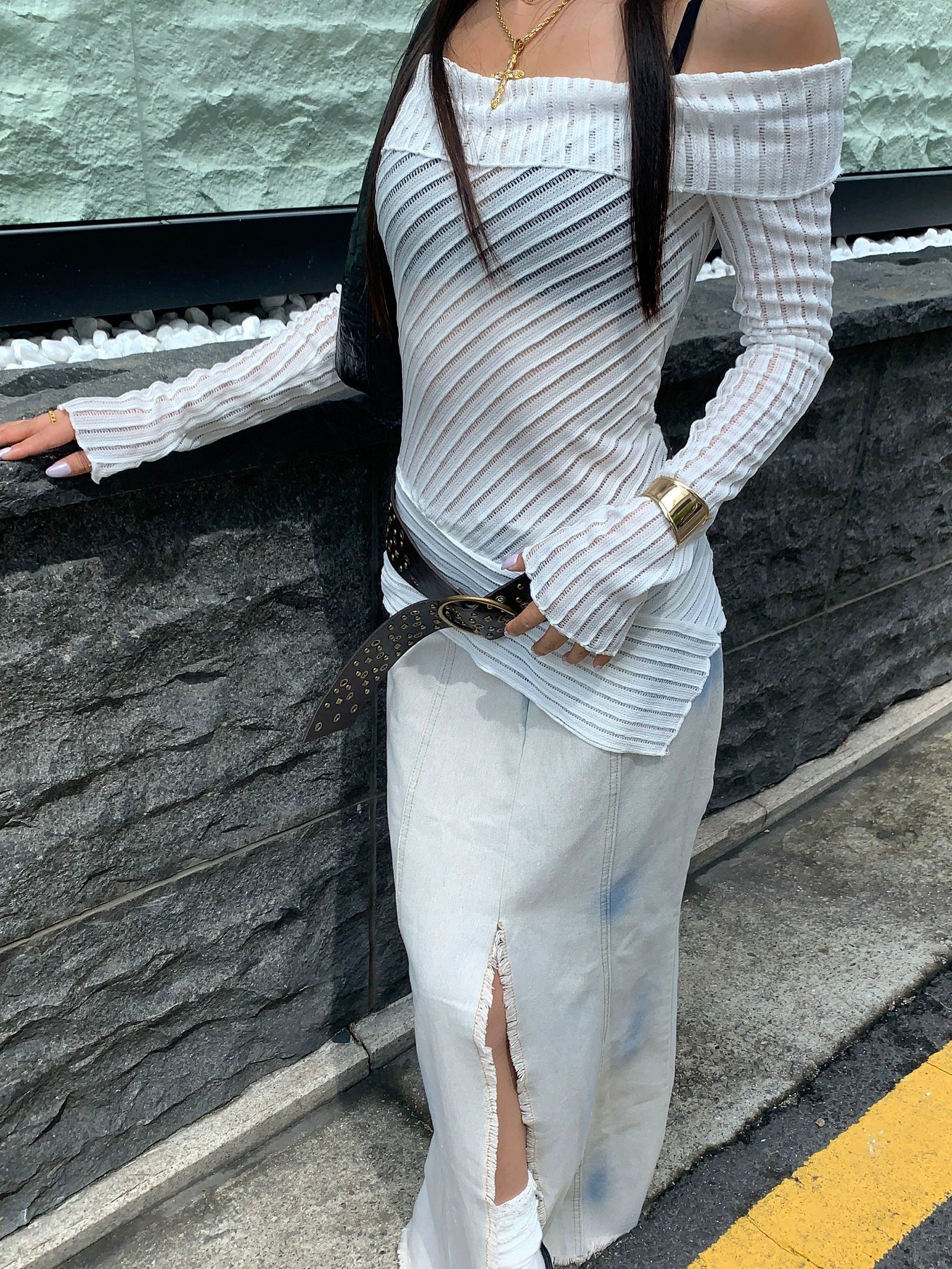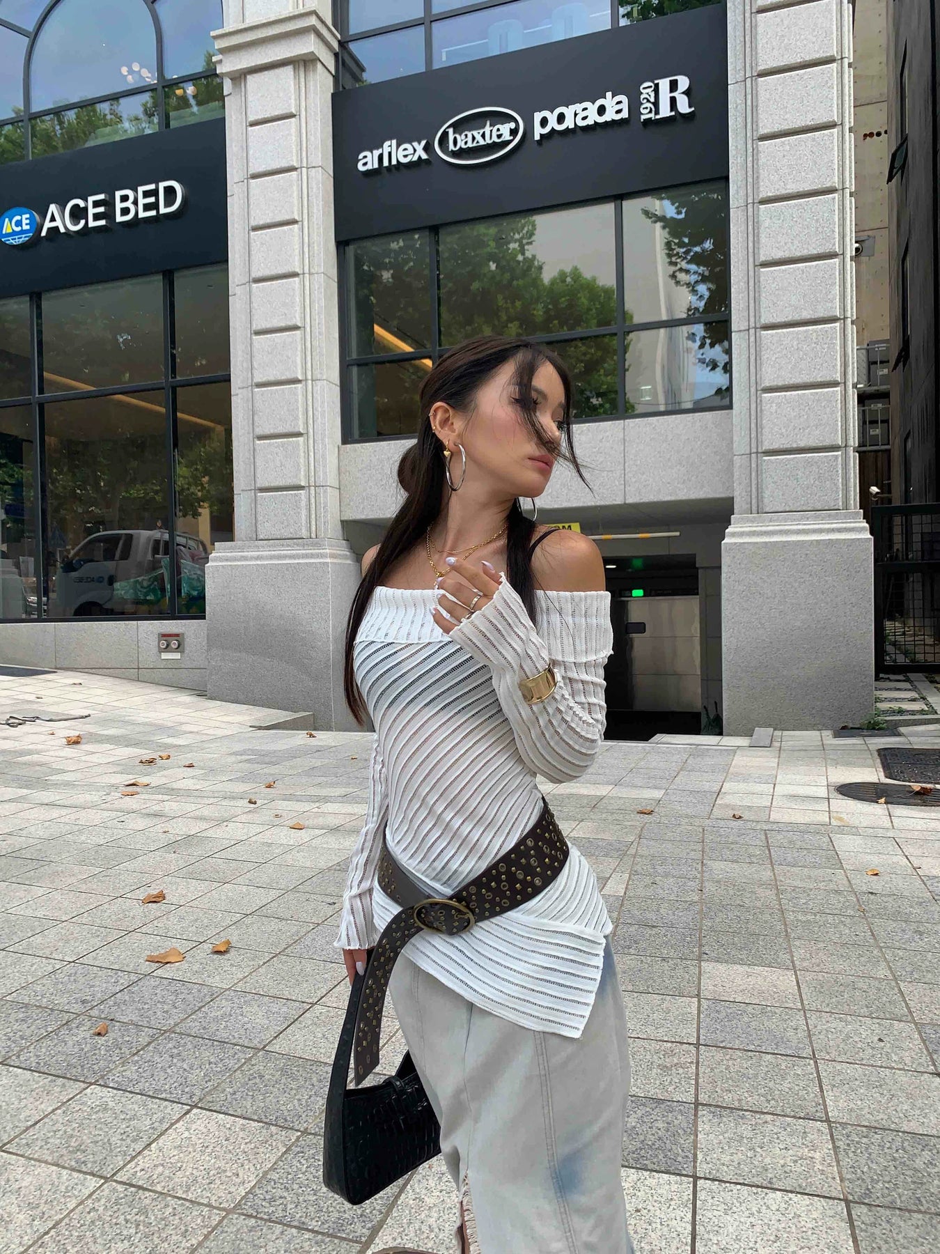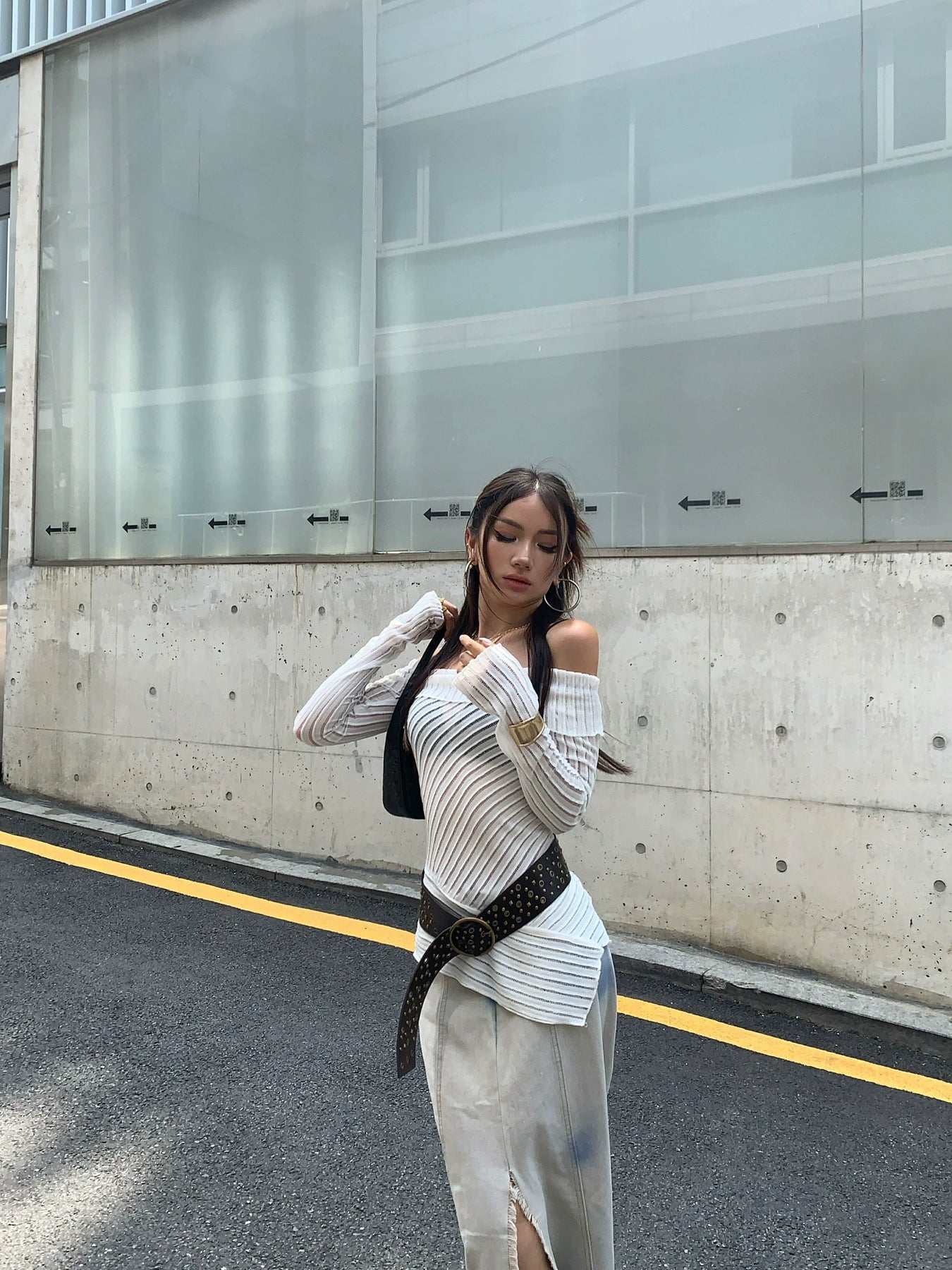 Effortlessly sultry and softly sculpted, the Alouette Sheer Off-Shoulder Top brings that delicate balance of elegance and allure. Made from a fine, semi-sheer knit with subtle metallic thread, it drapes beautifully off the shoulders and flows into flared sleeves and an asymmetrical hem that adds movement to every step.