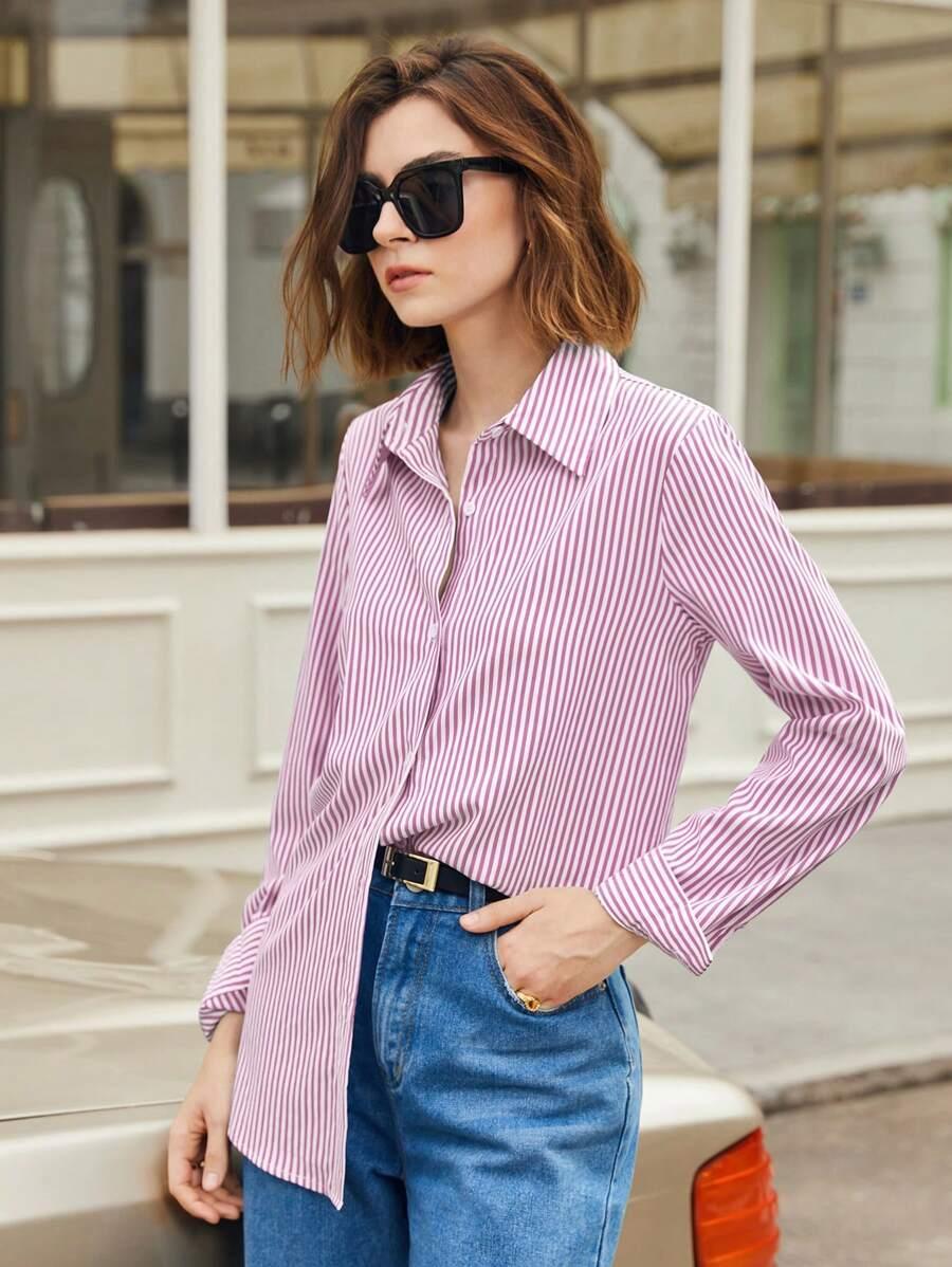 Timeless elegance meets quiet luxury in this Button Down Shirt with a Striped Pattern. The pink hue and classic stripes create a chic, minimalist look that remains graceful season after season. The collar, long sleeves, and regular hem shape a versatile silhouette, while the unlined, loose body drapes with ease for all-day comfort. An essential piece for old money style wardrobes and minimalist fashion alike.