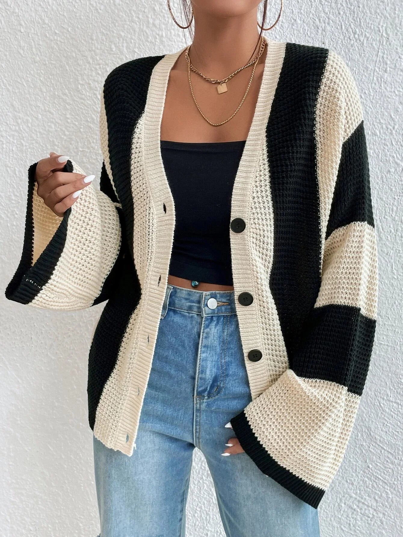 Make a statement in comfort with the Bold Lines Waffle Knit Cardigan, featuring wide contrast stripes and a relaxed, oversized fit. Crafted from soft waffle-textured knit, this open-button cardigan is designed with flared sleeves and chunky ribbed hems for a stylish yet cosy finish.