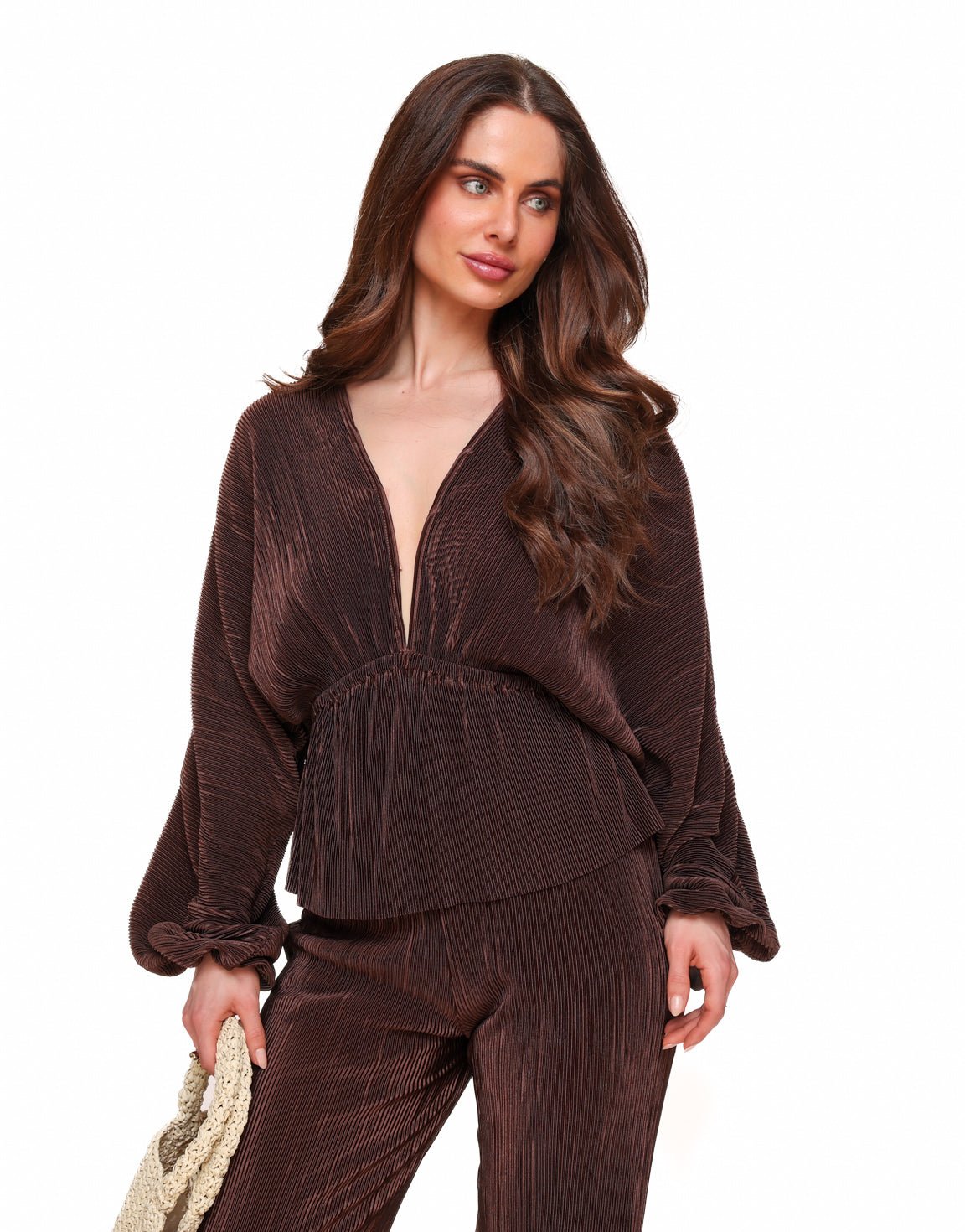 - Details: long sleeves / V-neck / elastic end of sleeves / elastic band in center of blouse / plissé / co-ord set