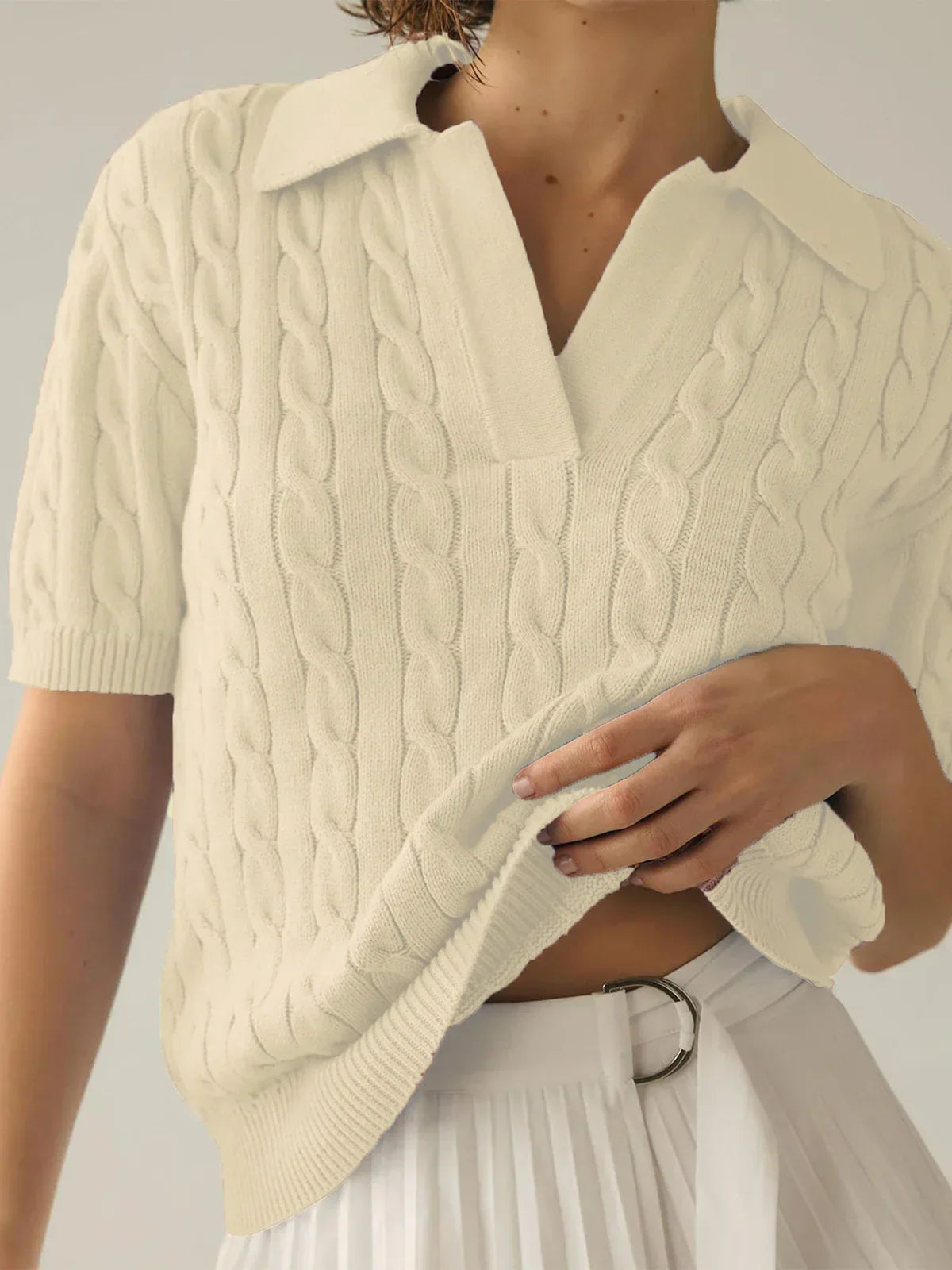 Design: A versatile V-neck knit top with short sleeves, offering a classic and minimalist style suitable for various outfits.