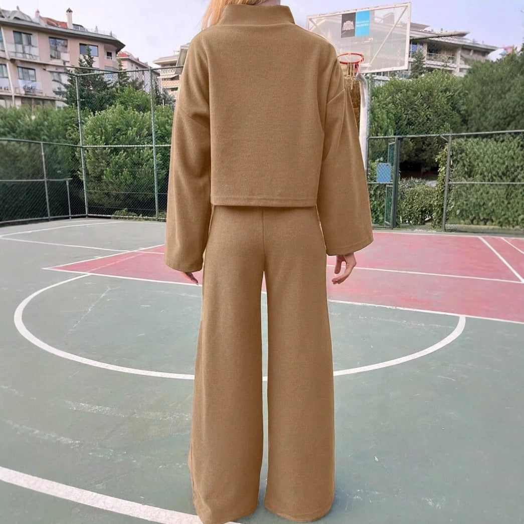 Minimal meets elevated in the Downtime Luxe Wide-Leg Lounge Set — a modern two-piece that blends softness with streetwear edge. The cropped mock-neck pullover and fluid wide-leg pants offer a relaxed silhouette that moves effortlessly from lounging to laid-back outings.