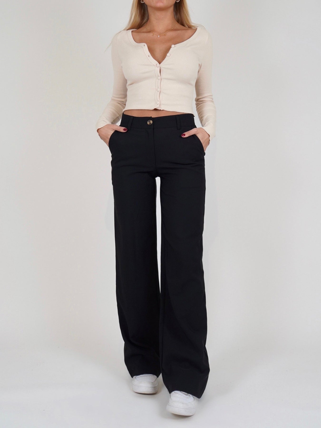 Black high-waisted trousers, with a bit of stretch. They fit like Vera Wide. The trousers are a straight model with quite a bit of width. The trousers have belt loops and close with a button. The trousers are made of soft material that is really comfortable and sits very well on the body.