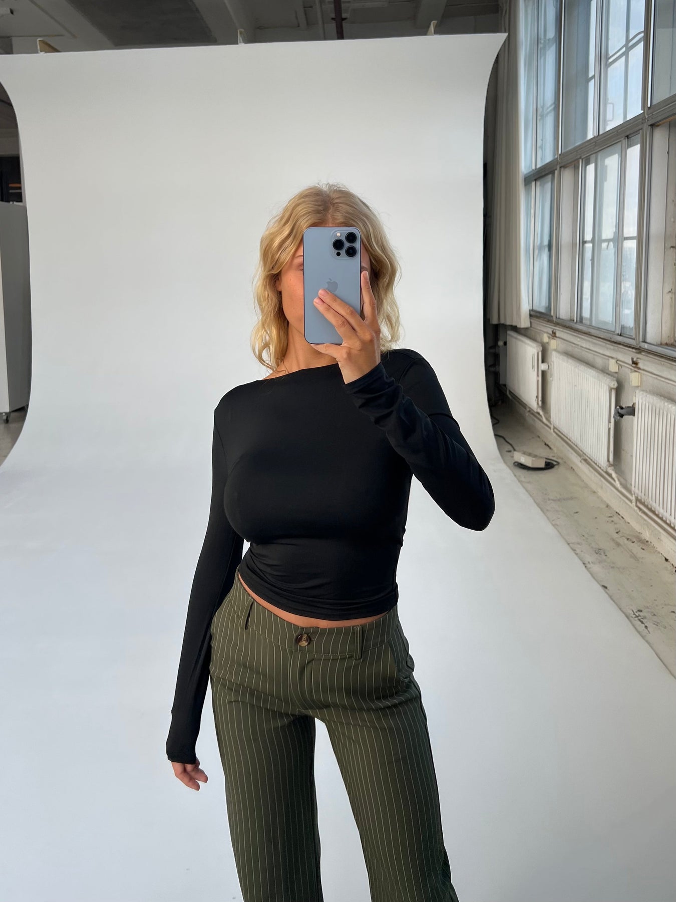 Pants in dark army with white stripes. The trousers are high-waisted and have a bit of stretch. They fit like Vera Wide. The trousers are a straight model with quite a bit of width. The trousers have belt loops and close with a button. The trousers are made of soft material that is really comfortable and sits very well on the body.