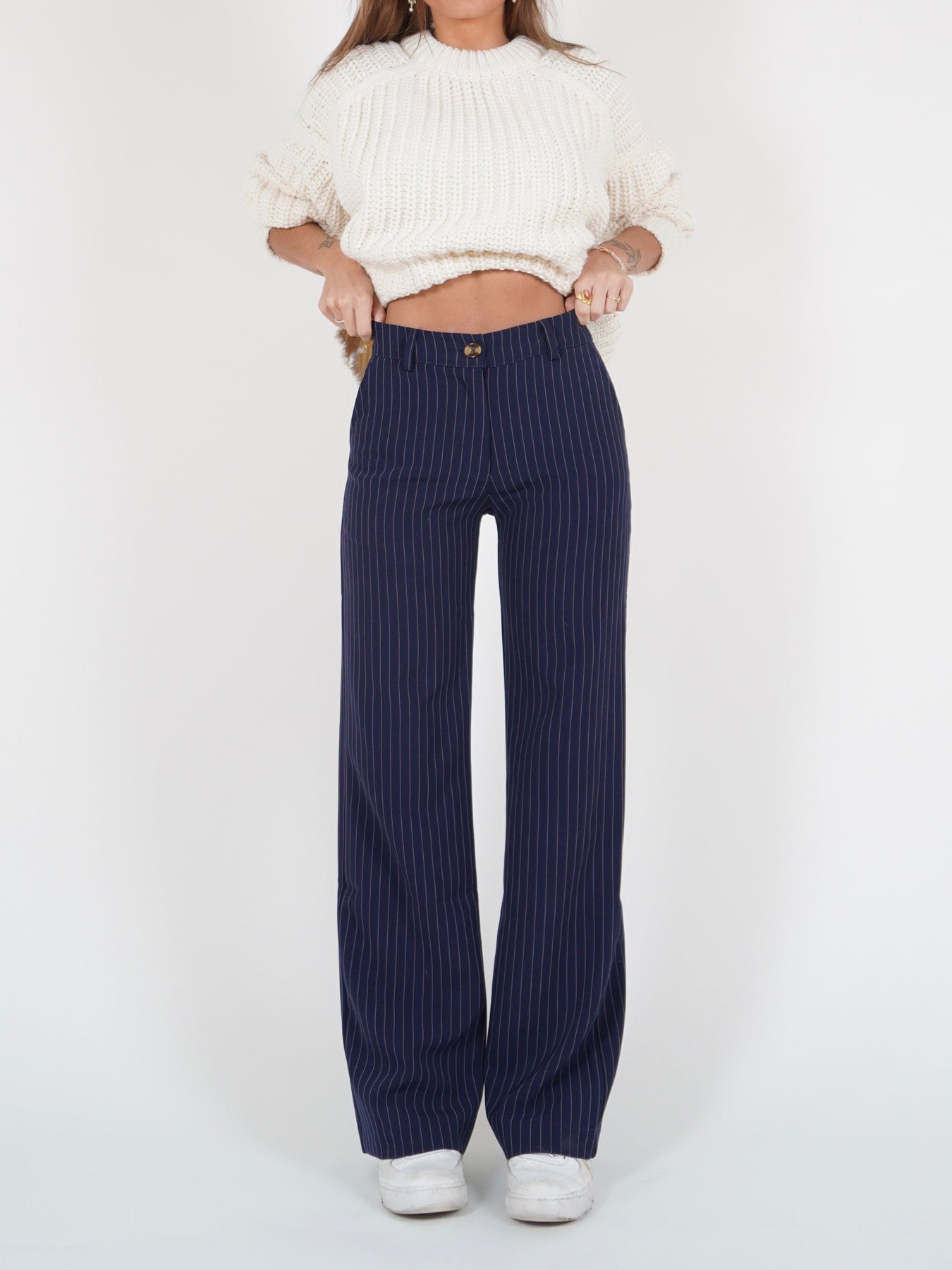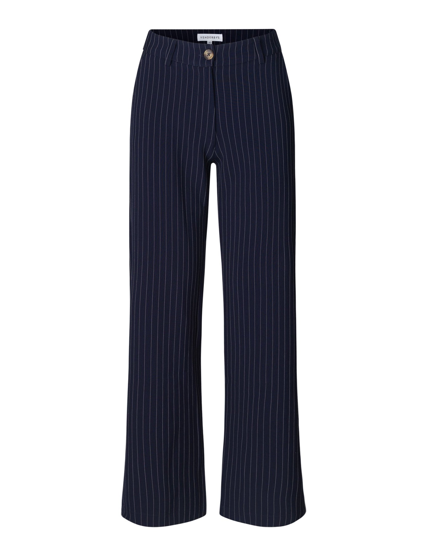 Trousers in dark blue, with white stripes. The trousers are high-waisted and have a bit of stretch. They fit like Vera Wide. The trousers are a straight model with quite a bit of width. The trousers have belt loops and close with a button. The trousers are made of soft material that is really comfortable and sits very well on the body.