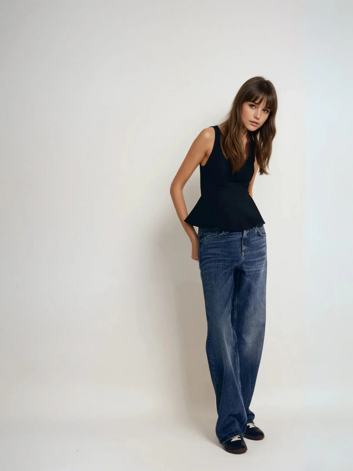Design: A sophisticated sleeveless top featuring a sharp square neckline, a flattering slim-fit bodice, and a peplum hem that adds feminine flair and structure to the silhouette.
