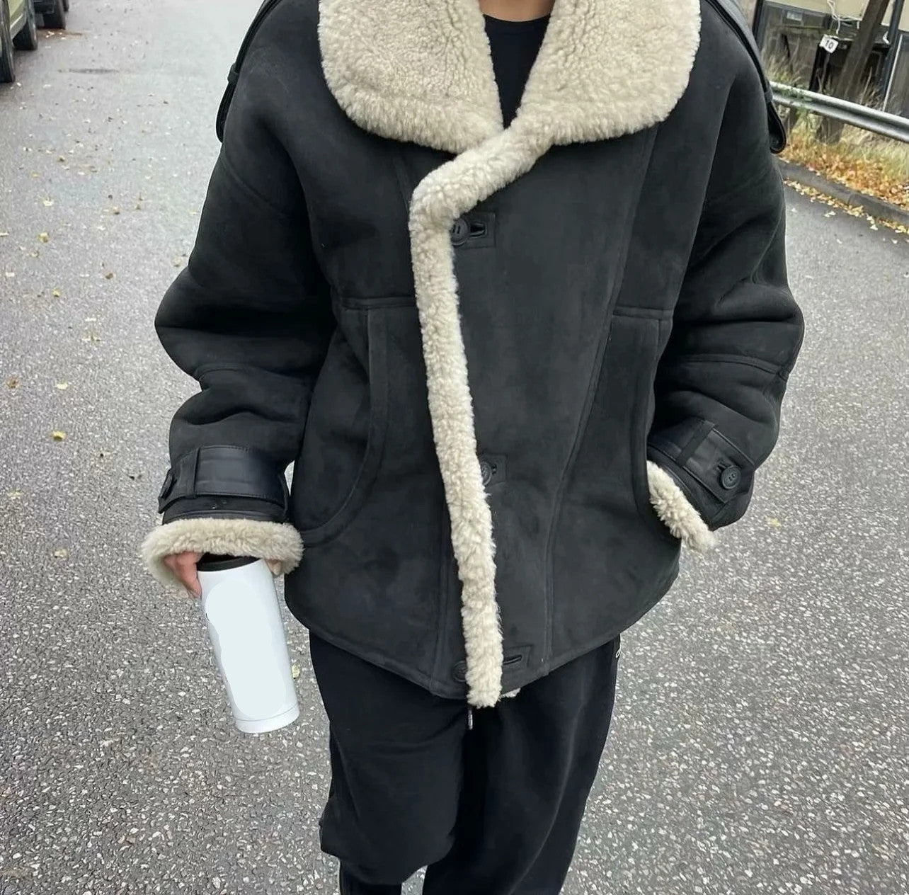 Bold, rugged, and unapologetically cool, the Sutton Shearling Aviator Jacket brings serious edge to your cold-weather wardrobe. Crafted with a washed-effect outer and a plush faux shearling lining, this oversized jacket fuses vintage aviator vibes with modern street style. Chunky buttons, dropped shoulders, and exposed seams add to its effortlessly undone charm.