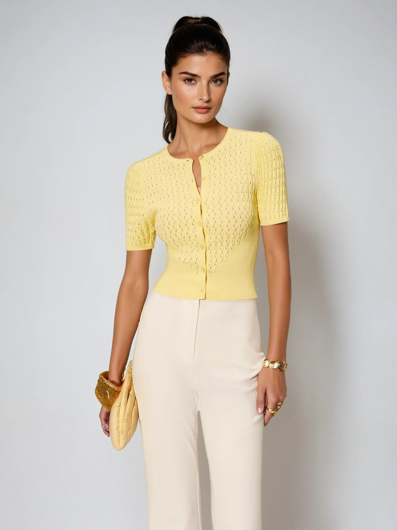 Design: A chic hollow knit buttoned top featuring a semi-sheer open-knit texture, classic collar, and front button closure for a blend of casual elegance and breathable style.