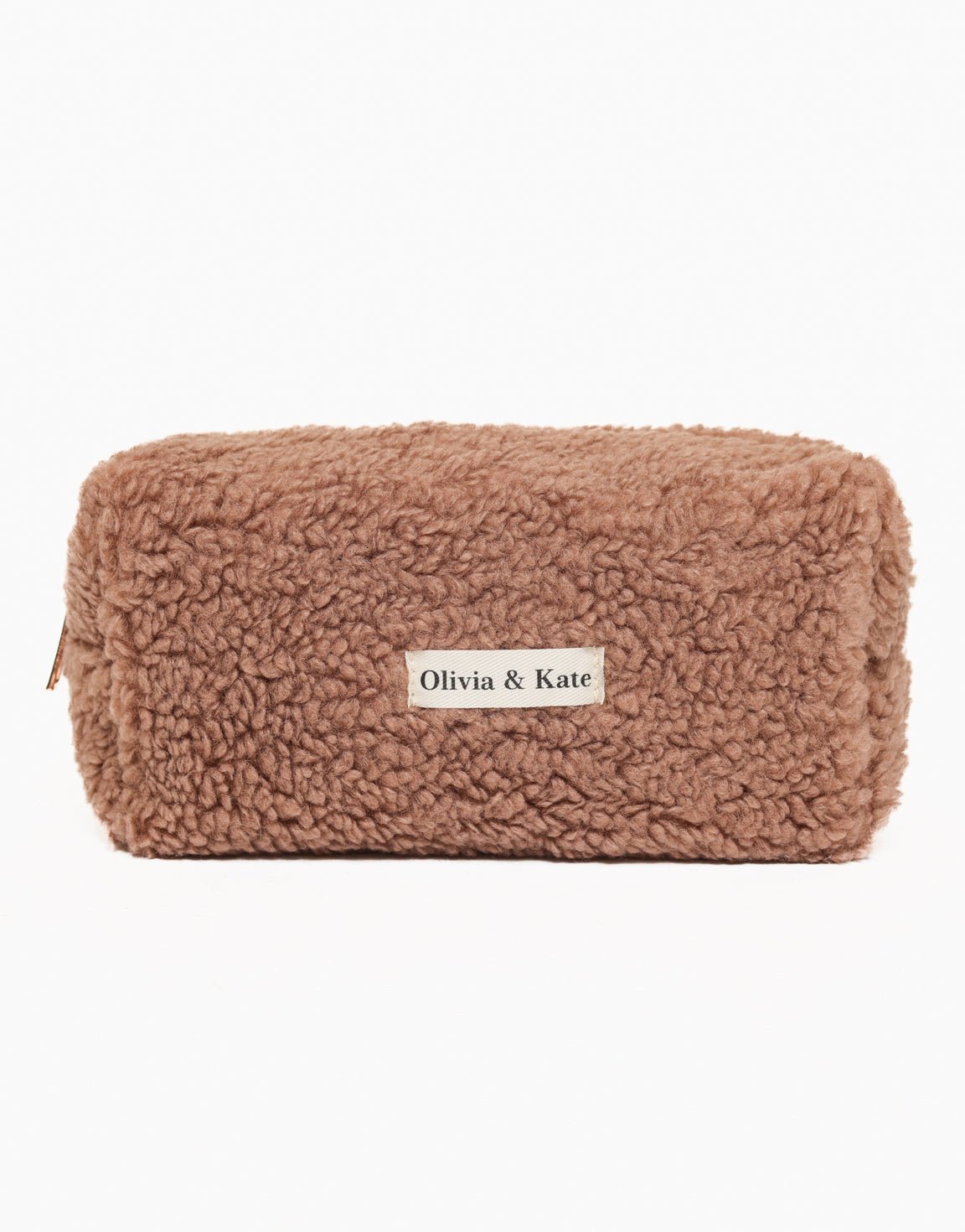 - Details: teddy stof / Olivia & Kate logo aan de voorkant / goudkleurige rits sluiting aan de bovenkant