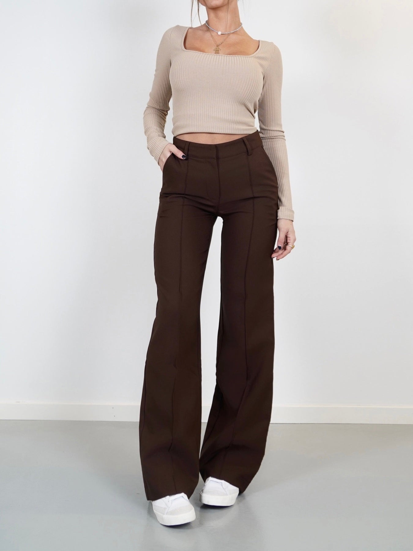 Are you missing a pair of trousers in a classic, straight fit and in a slightly different, yet neutral colour? Then our Vera Wide trousers in dark brown are absolutely perfect. The beautiful espresso-like shade is obvious if you want to add some warmth to your outfit, but at the same time want some trousers that can go with the rest of the wardrobe.