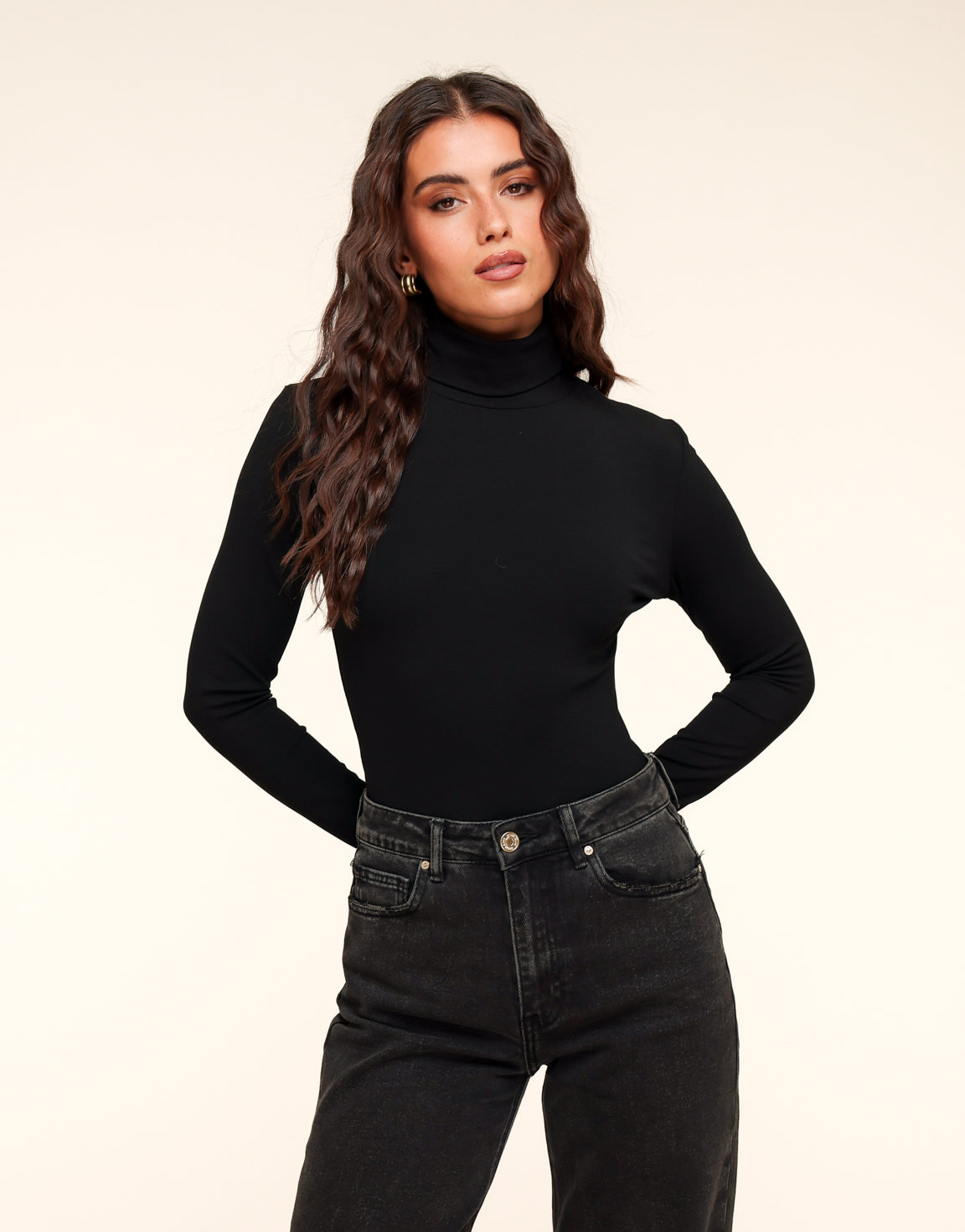 - Details: bodysuit with hook closures at the bottom / long sleeves / high neck / stretchy