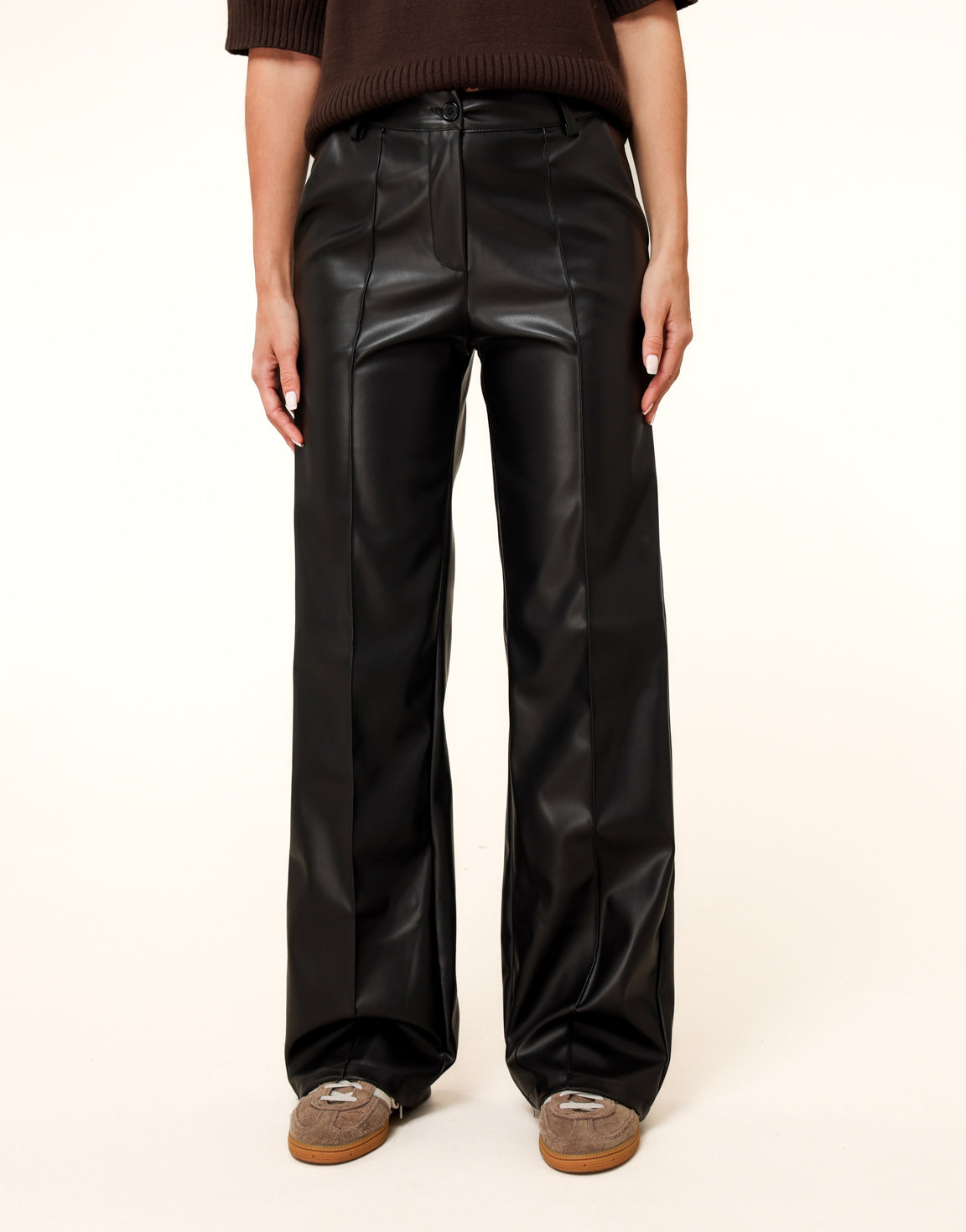 - Details: PU leather trousers / button and zip closure / belt loops / little bit of stretch / two front pockets / wide fit